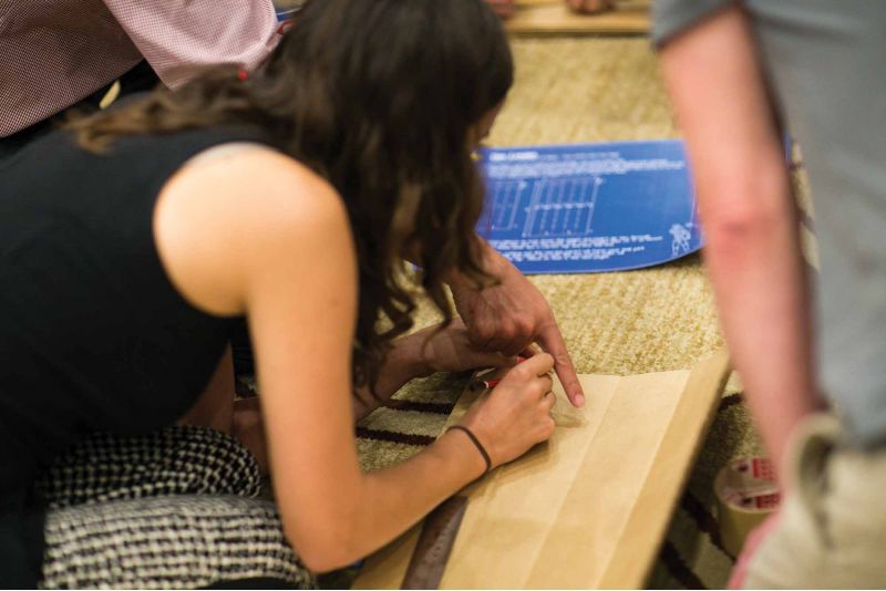 In Puppet Masters teams collect kits and props and then examine and discuss construction instructions. They divide into sub-teams to complete the various parts of the puppet. The puppet is assembled, controls affixed and the puppet decorated. Then the team stand the puppet up with the 9 controllers and work to perform simple human actions.